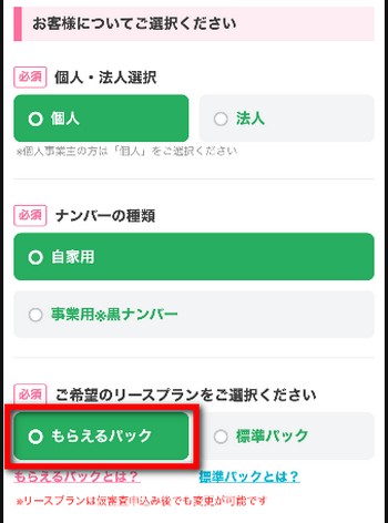 「ご希望のリースプランをご選択ください」欄で「もらえるパック」を選択すると、リース契約満了後は追加費用0円で、お車を自分のものに出来ます。